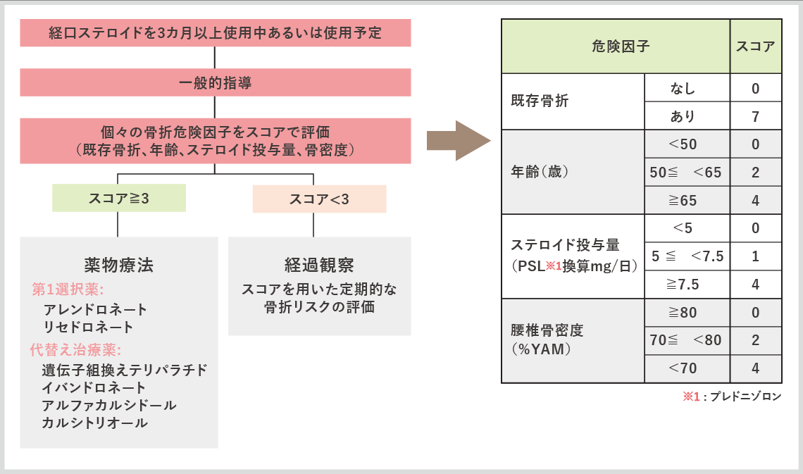 ステロイドを内服中もしくは内服予定の患者さんは注意が必要です。以下の条件に当てはまる患者さんは骨密度に関係なく骨粗鬆症の治療が必要です。
